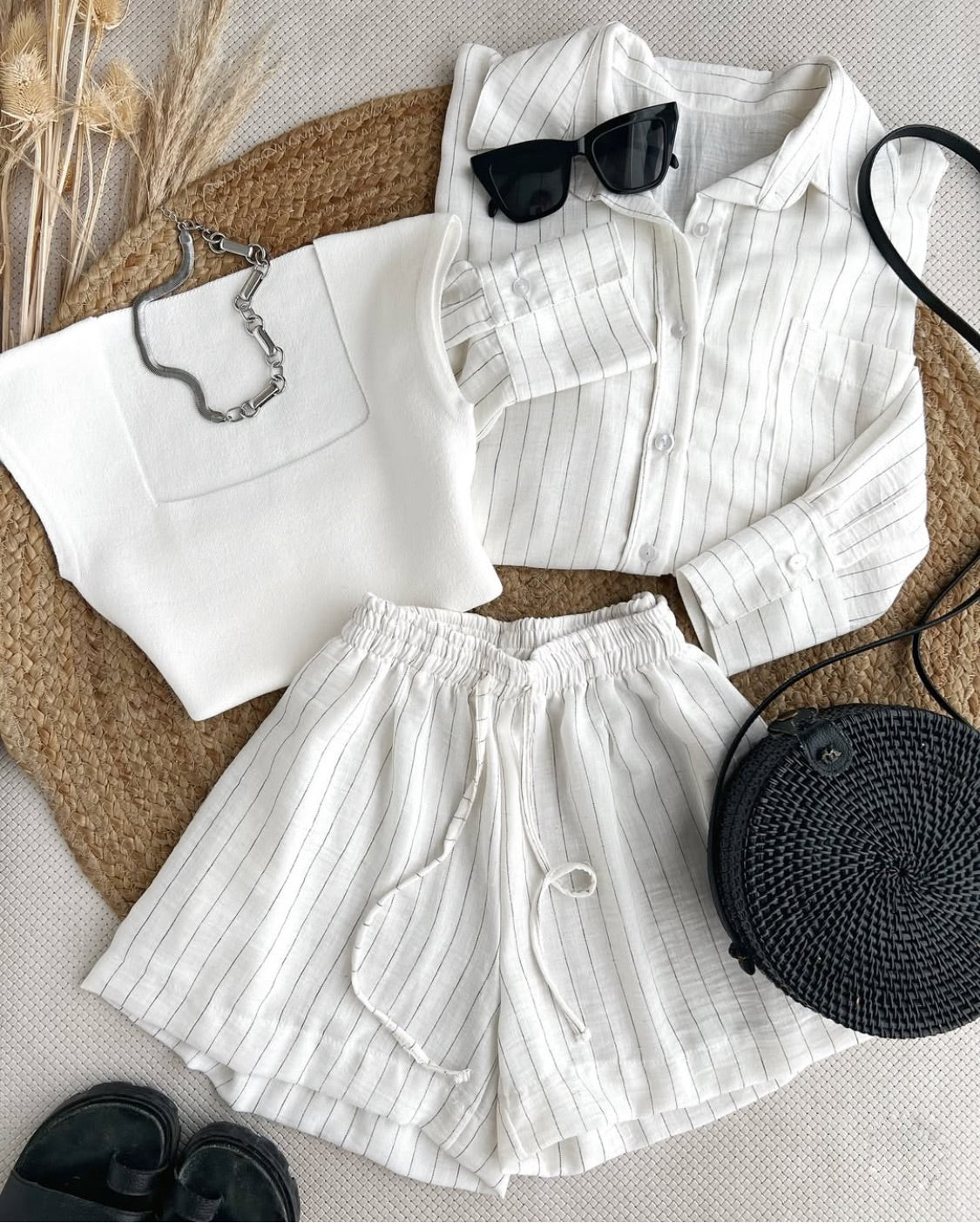 El set incluye 1 camisa manga larga con un bolsillo delantero y 1 short elastizado en la cintura con cinta para amarre.